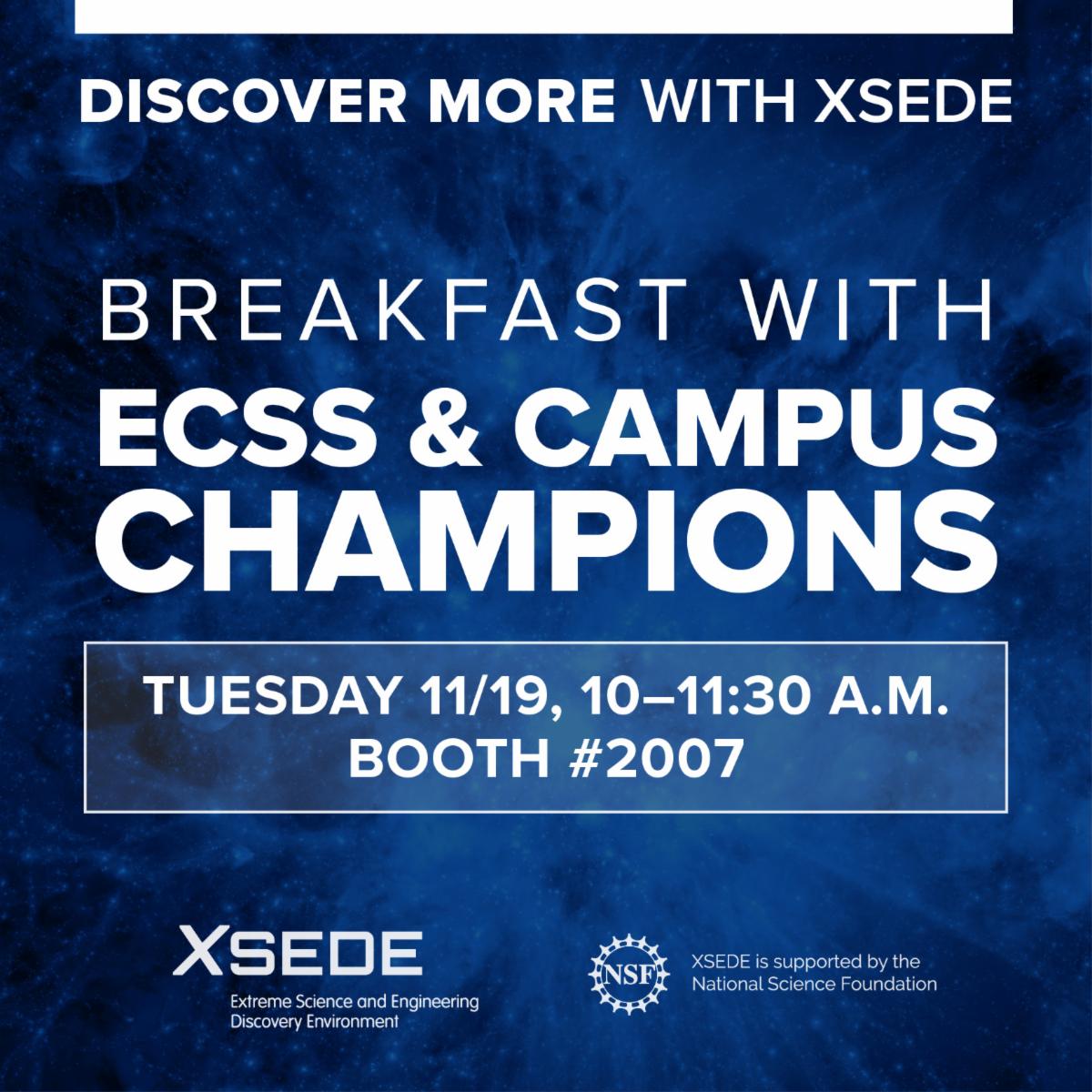 Join us in booth #2007 on Tuesday, November 19 from 10-11:30 a.m. to learn more about our Extended Collaborative Support Services (ECSS) and Campus Champions teams! Stop by and grab breakfast, network with the staff, and learn about how we can help accelerate research!